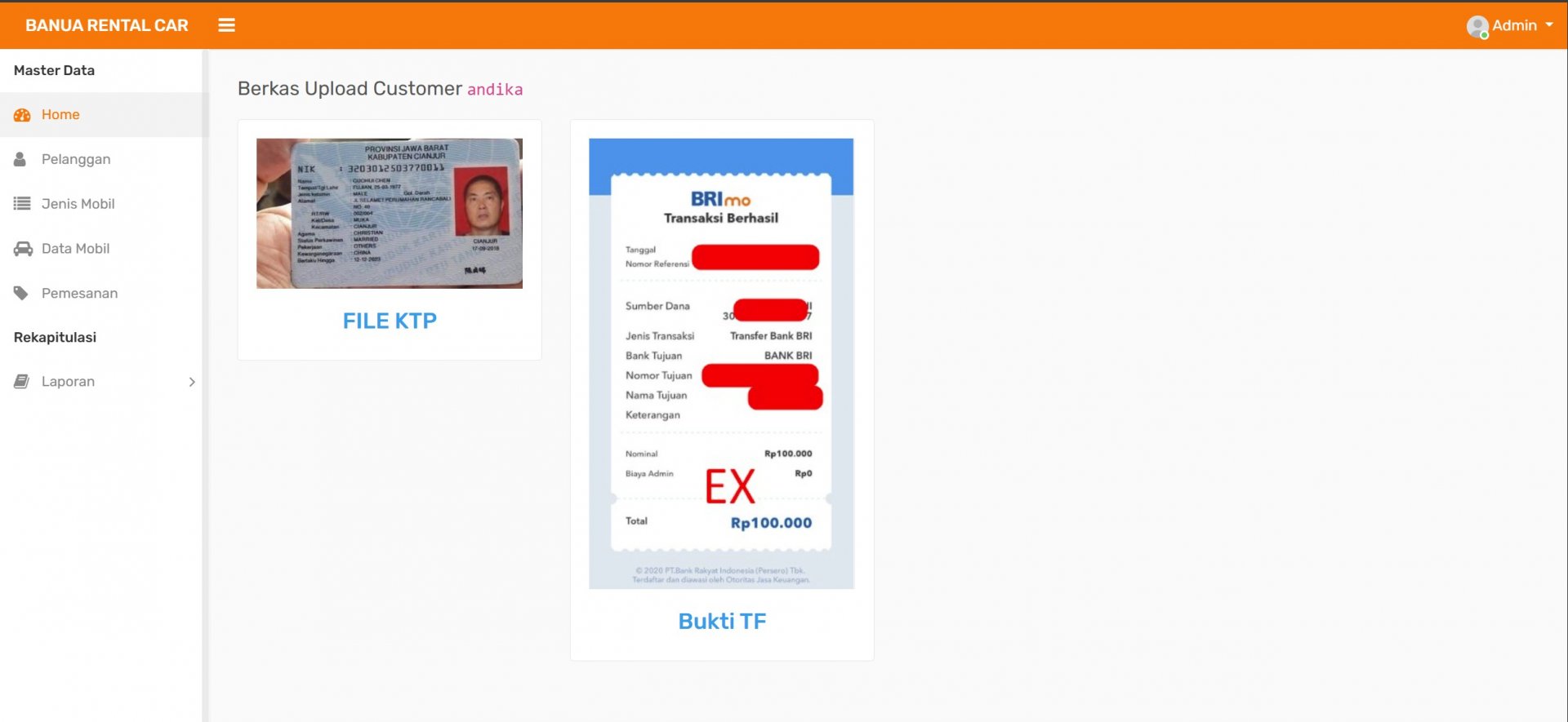 Pada halaman admin, pengelola dapat melakukan berbagai aktivitas manajemen data seperti mengelola data mobil, jenis mobil, data pelanggan, serta memproses pemesanan kendaraan. Admin juga dapat melihat ringkasan data pada dashboard yang menampilkan jumlah mobil yang tersedia, jumlah pelanggan, serta jumlah transaksi pemesanan yang telah dilakukan.