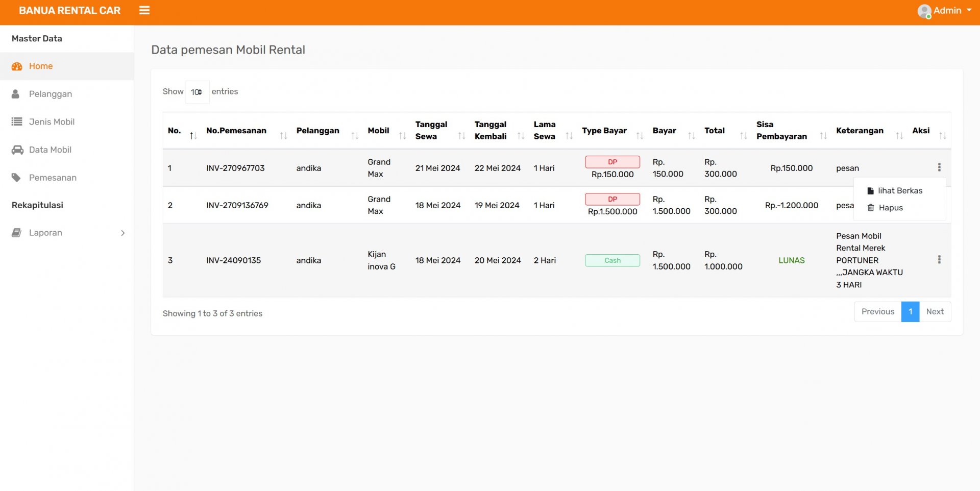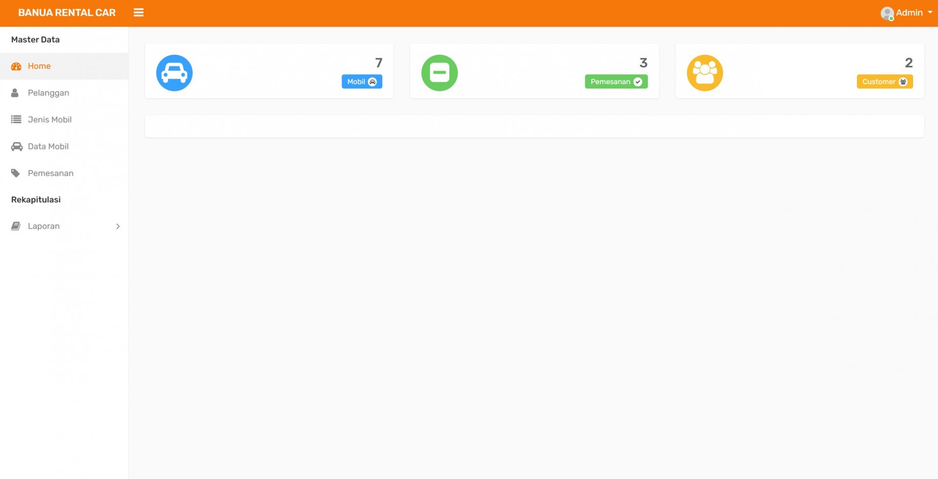 Pada halaman admin, pengelola dapat melakukan berbagai aktivitas manajemen data seperti mengelola data mobil, jenis mobil, data pelanggan, serta memproses pemesanan kendaraan. Admin juga dapat melihat ringkasan data pada dashboard yang menampilkan jumlah mobil yang tersedia, jumlah pelanggan, serta jumlah transaksi pemesanan yang telah dilakukan.